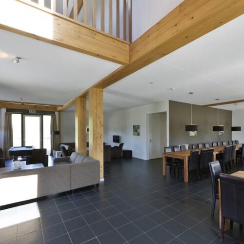 De ruime verblijfsruimte bestaat uit een eet- en zitgedeelte. Ook beschikt de verblijfsruimte over een vide met pooltafel. De compleet ingerichte rvs keuken beschikt onder andere over een convectieoven, professionele vaatwasser en 2 horecafornuizen met wasemkap. Verder beschikt de keuken over een spoeleiland, 2 koelkasten en 2 vrieskasten. Indeling van de kamers: Er zijn in totaal 14 kamers van gemiddeld 30 m2 voor 4 personen, verdeeld over twee verdiepingen met ieder eigen sanitair (douche, wastafel en toilet). Er zijn 4 kamers met een bedstede met daarin twee bedden. Alle overige bedden zijn boxspringbedden. Eén kamer op de begane grond is gebouwd als MIVA (mindervaliden)kamer en beschikt over de bijbehorende voorzieningen. Ook in de hal op de begane grond bevindt zich een apart mindervalidentoilet. Bij de hoofdingang bij de gemeenschappelijke ruimte zijn toiletten (2 dames en 2 heren) aanwezig, hier bevindt zich ook een verschoningsvoorziening voor baby’s. Als onderdeel van de groepsaccommodatie is nog een nieuw gebouw gerealiseerd, in de stijl van de boerderij. Dit gebouw kan worden gebruikt als vergader- en/of trainingslocatie en heeft een capaciteit van circa 30 personen. Dit gebouw beschikt over aparte toiletten, keuken en een terras aan een grote vijver. U hebt de mogelijkheid deze ruimte bij te huren.