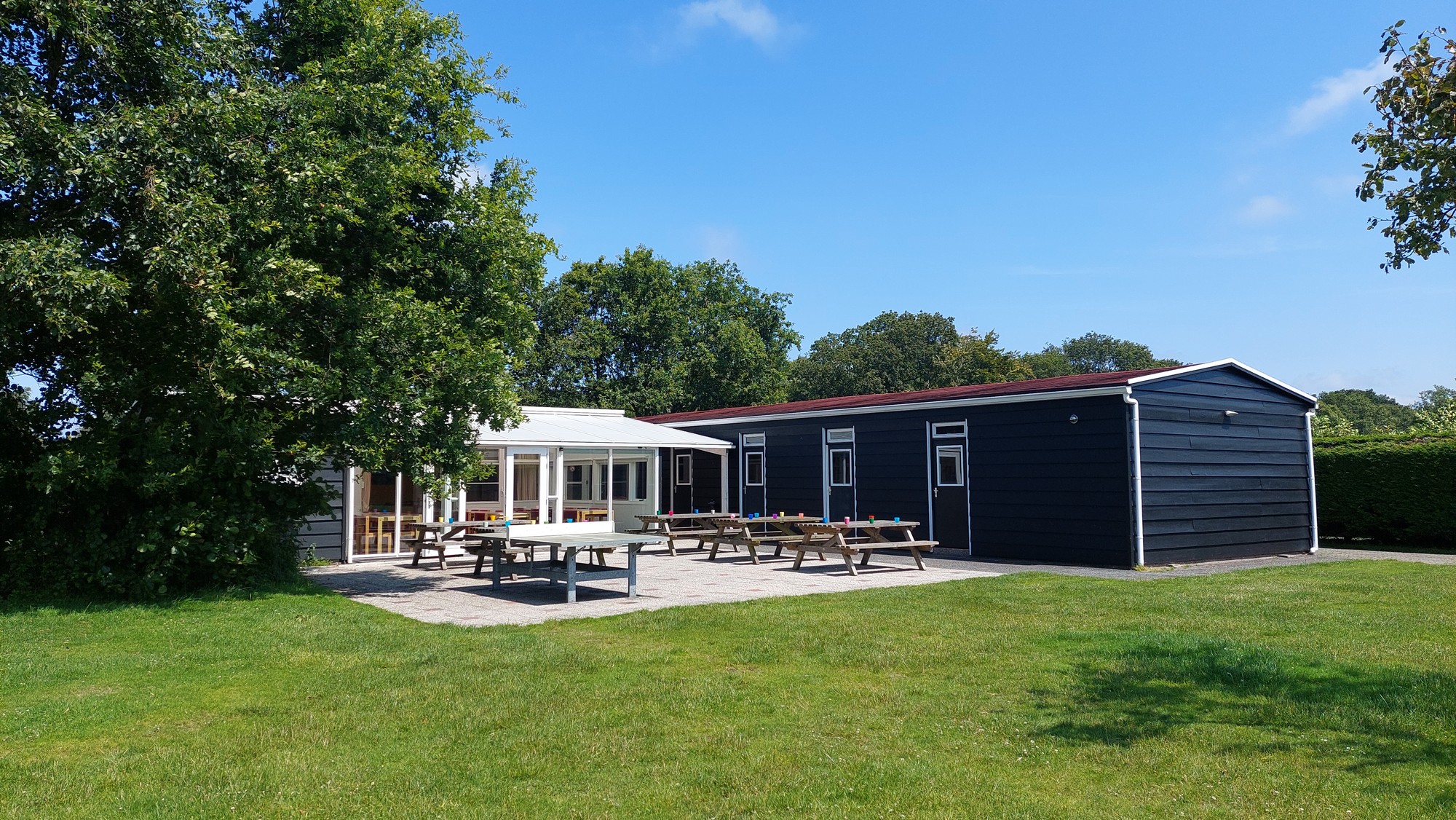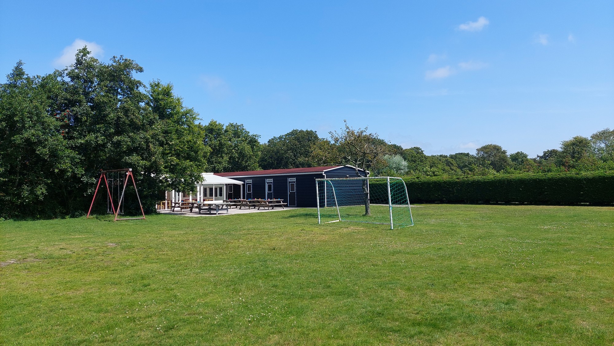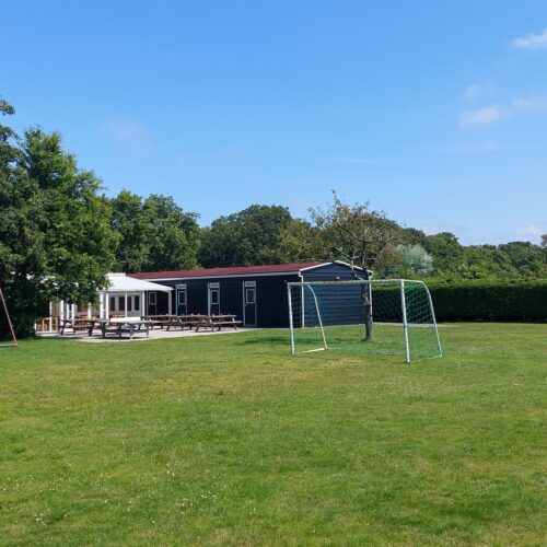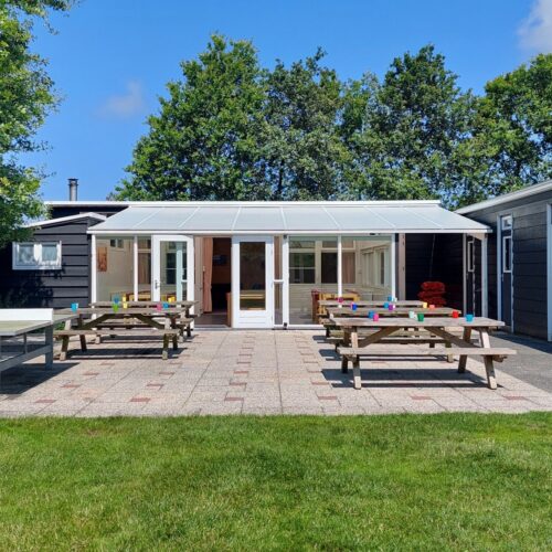 Aan de duinen in Burgh-Haamstede een accommodatie voor 30 personen met 6 slaapkamers met serre en terras en een groot speelveld (1000m2).