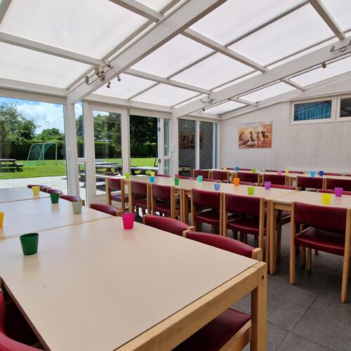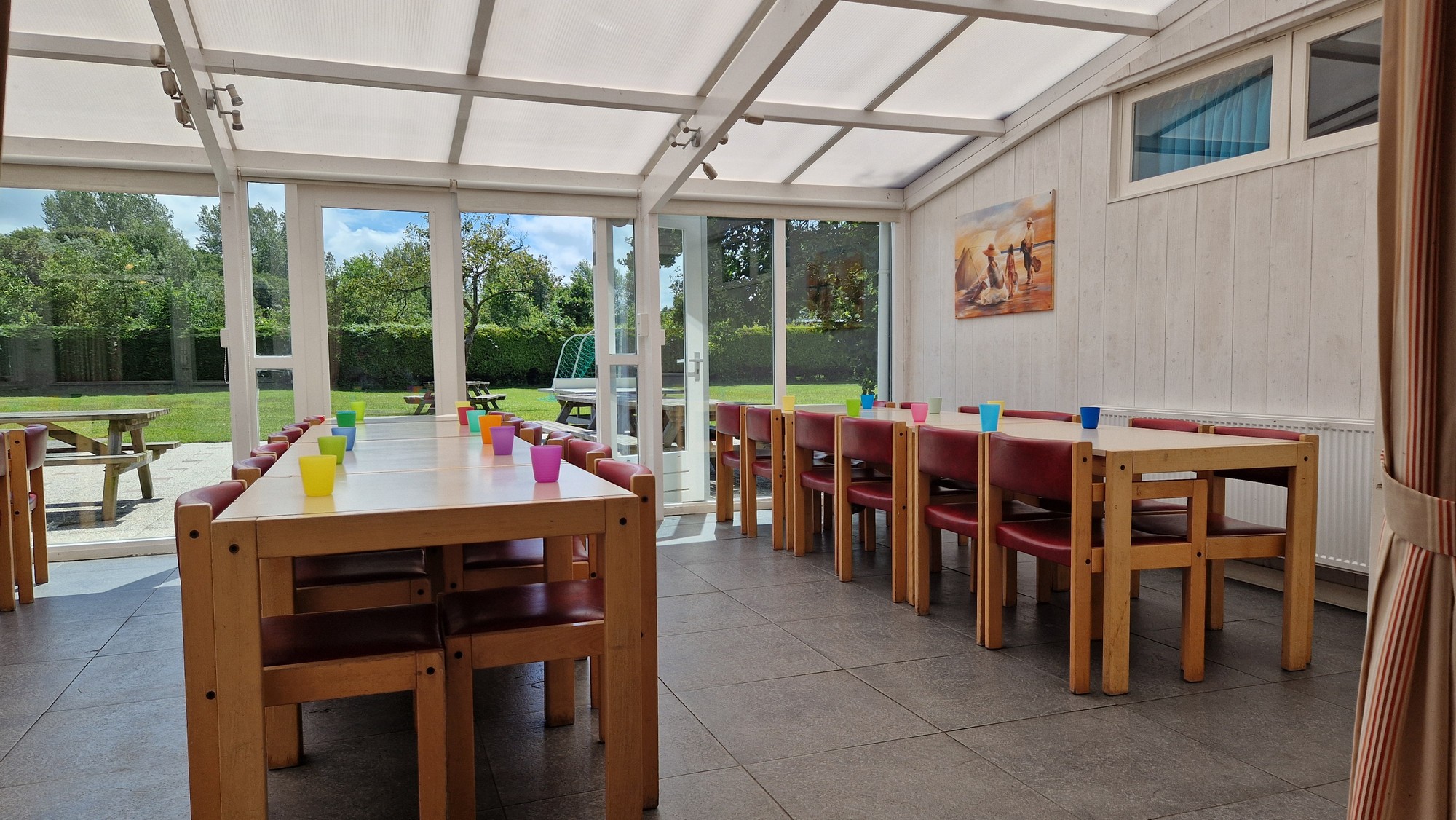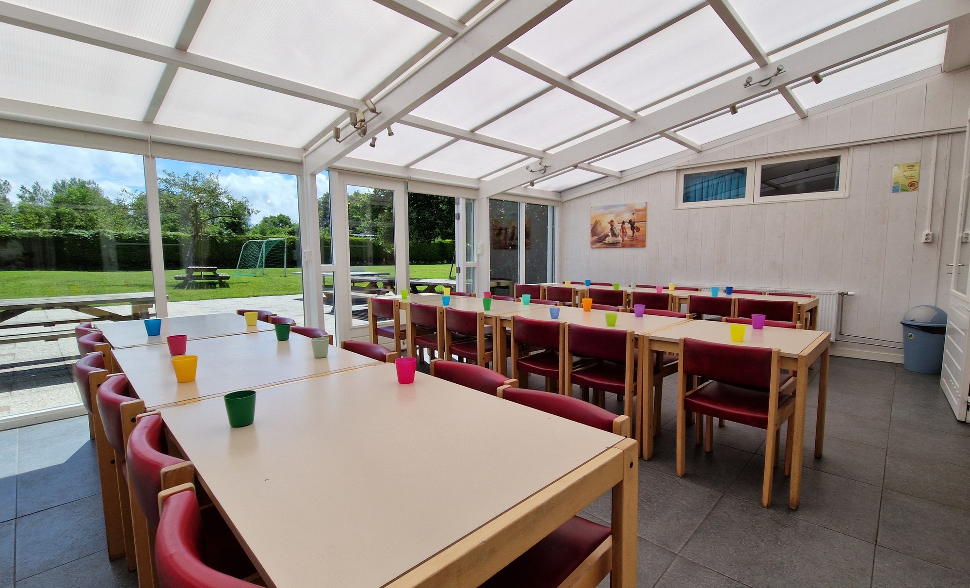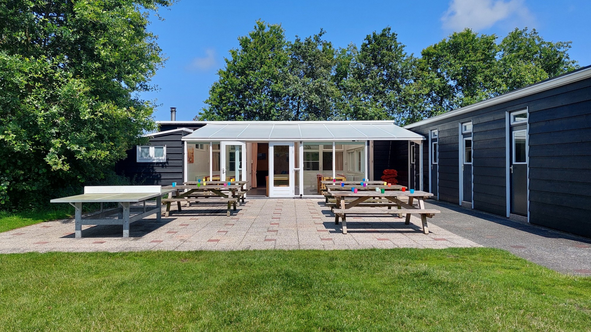Aan de duinen in Burgh-Haamstede een accommodatie voor 30 personen met 6 slaapkamers met serre en terras en een groot speelveld (1000m2).