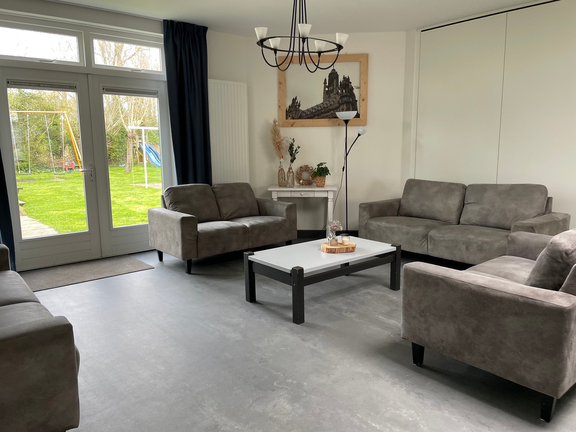 Aan de voorkant van het gebouw bevindt zich een prachtige tuin. Elke groepsaccommodatie bezit hier een eigen gedeelte van. Ook beschikt ieder huis over een terras met tuinmeubilair en barbecue. Het gezamenlijke grasveld met speelweide is fantastisch voor sport en biedt speelmogelijkheden voor kinderen. Auto’s kunnen op de parkeerruimte van het terrein of aan de weg geparkeerd worden.